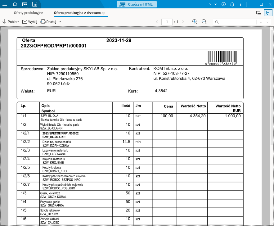 • Oferta produkcyjna z drzewem specyfikacji – wydruk zawierający pełną specyfikację produkcji.