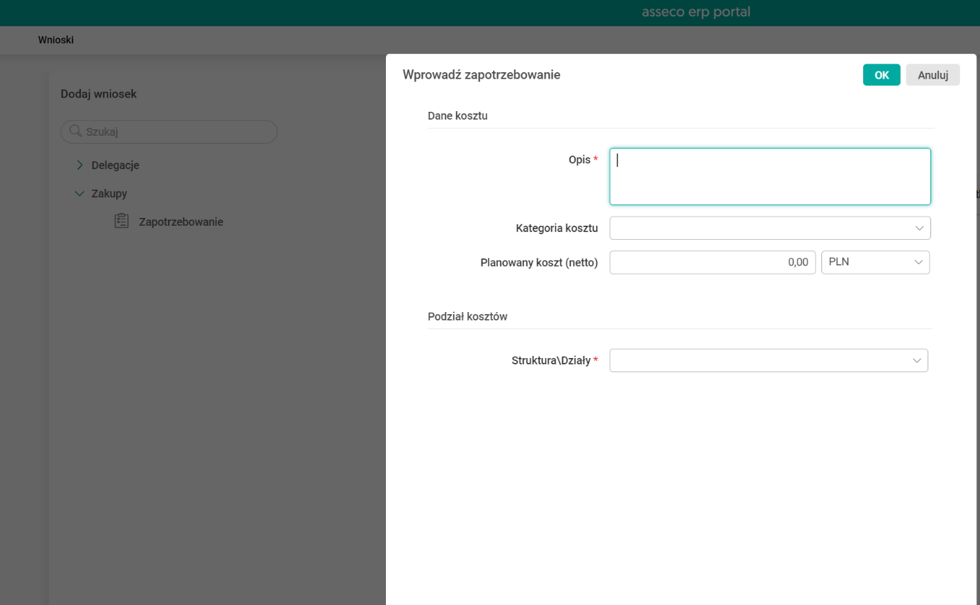 W tym celu w menu systemu wybiera właściwy formularz Wprowadź zapotrzebowanie, który następnie uzupełnia konkretnymi danymi, takimi jak: kategoria kosztu, data zakupu, dział – źródło kosztu, kwota zakupu, opis lub innymi danymi, których wymagalność została odpowiednio skonfigurowana. Nowy wniosek jest z automatu przypisany do wprowadzającego go pracownika i po jego wprowadzeniu do systemu zaczyna być cyfrowo procesowany – zgodnie ze zdefiniowaną w systemie ERP ścieżką akceptacji.