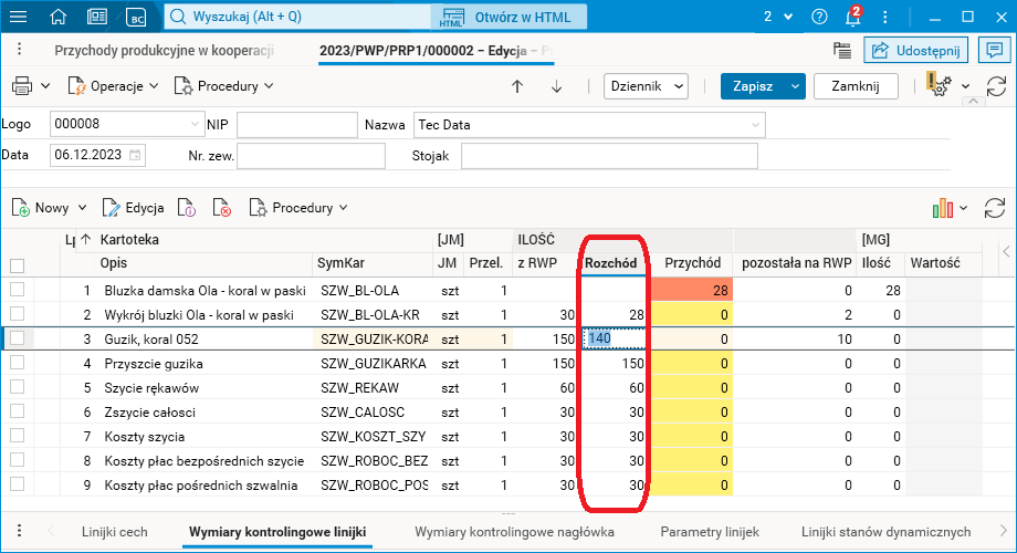 W momencie generowania przyjęcia produktu od podwykonawcy wygenerowany dokument przyjęcia PWP pozostaje w stanie Edycja i może zostać zmodyfikowany. Dzięki zmianie operator może zaewidencjonować zużycie surowców zgodnie z rzeczywistym rozchodem. Robi to modyfikując ilość w kolumnie Rozchód, która zainicjowana jest zużyciem normatywnym.