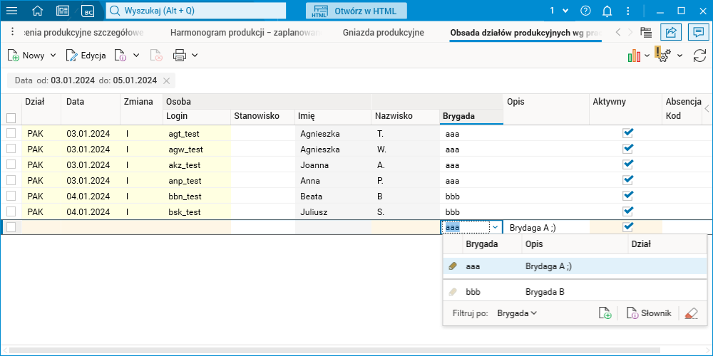 W celu poprawnego działania definiowania obsady z użyciem brygady w słowniku Obsada działów produkcyjnych wg pracownikami wprowadzono zabezpieczenia eliminujące sytuacje mogące doprowadzić do błędu lub niejednoznaczności we wprowadzanych danych. Dlatego zablokowano możliwość zmiany brygady na zapisanych wierszach oraz komunikat informujący o błędzie w przypadku jednoczesnego definiowania pracownika i brygady na dodawanym wierszu.