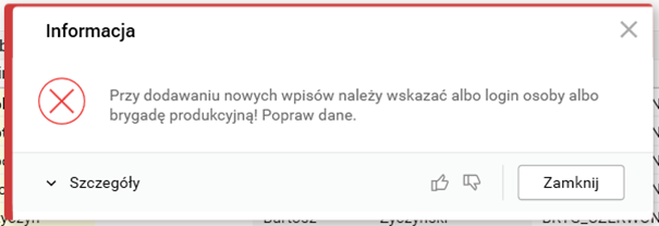 Rys. Informacja blokująca dodanie wpisu, gdy podano i login pracownika i brygadę produkcyjną