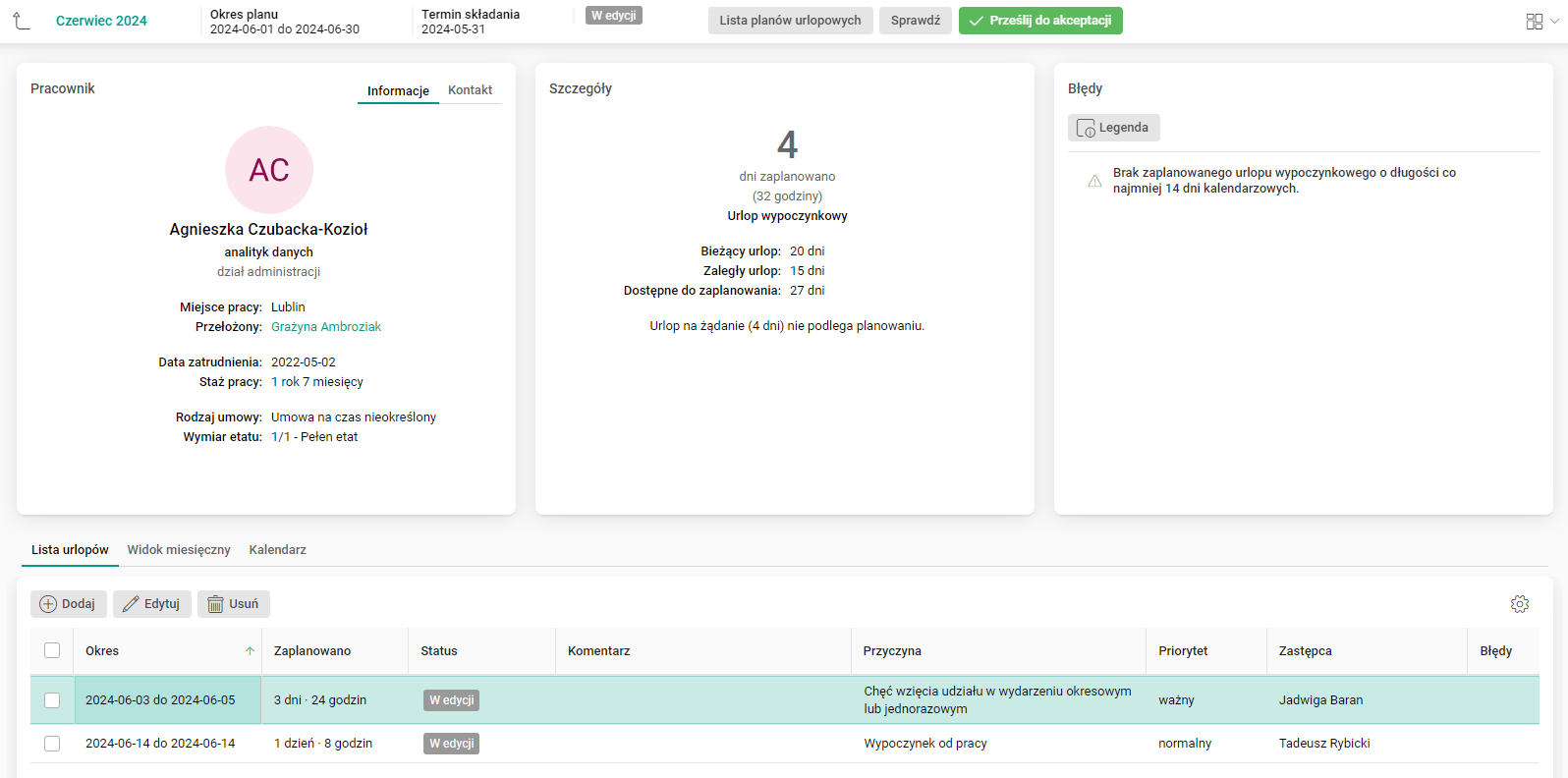 Aby zaplanować nieobecności w ramach przekazanego nam planu, otwieramy jego kartę i za pomocą akcji Dodaj dodajemy kolejne urlopy planowane. Do czasu przesłania planów do akceptacji przełożonego możemy wprowadzać poprawki do zarejestrowanych urlopów, a także dodawać i usuwać je.