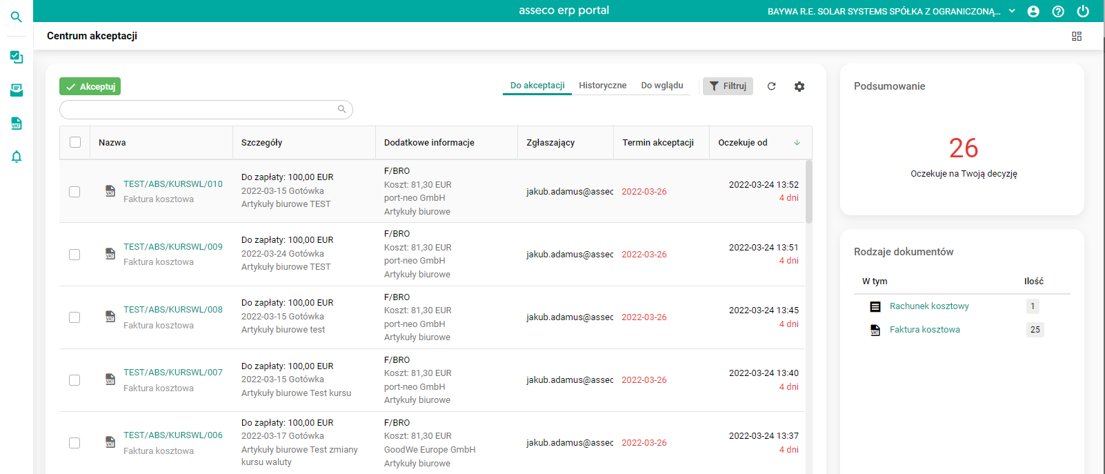 Dla tak wprowadzonego dokumentu nie wygenerują się ścieżki akceptacji zarówno kierownika działu logistyki, jak i dyrektora – dokument zostanie jedynie zweryfikowany przez księgowość, a zatem zostanie zrealizowany jedyny w tym przypadku i ostatni etap autoryzacji.