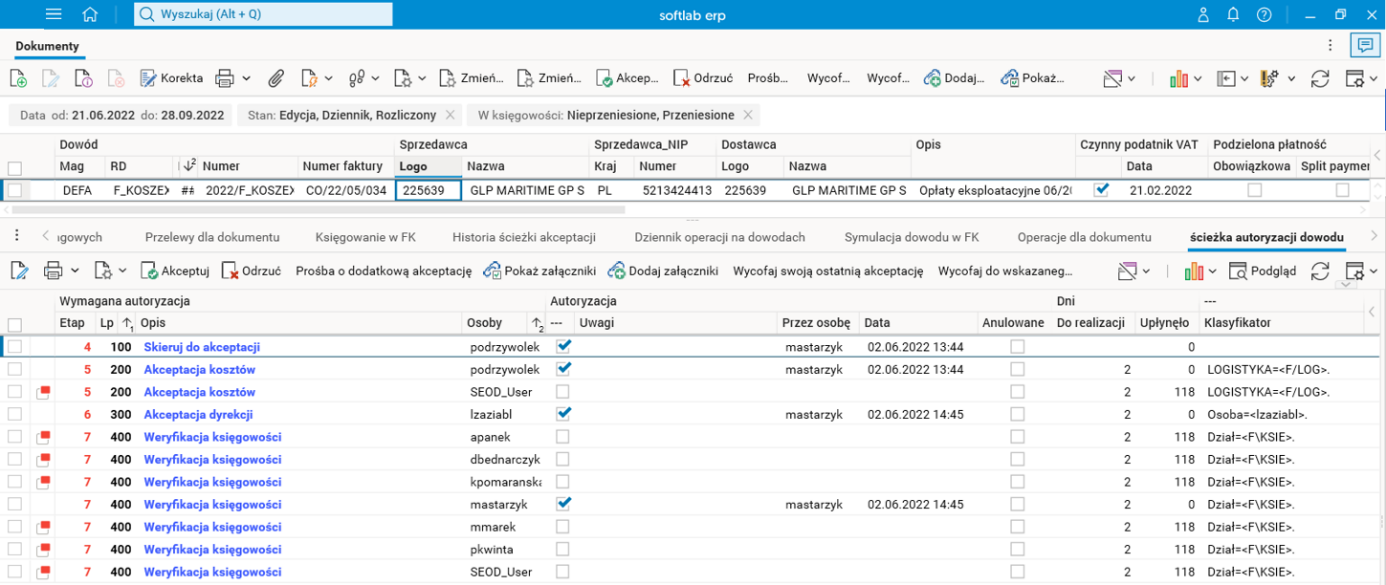 Rys. 2. Softlab ERP, Sekretariat, Ścieżka autoryzacji dowodu