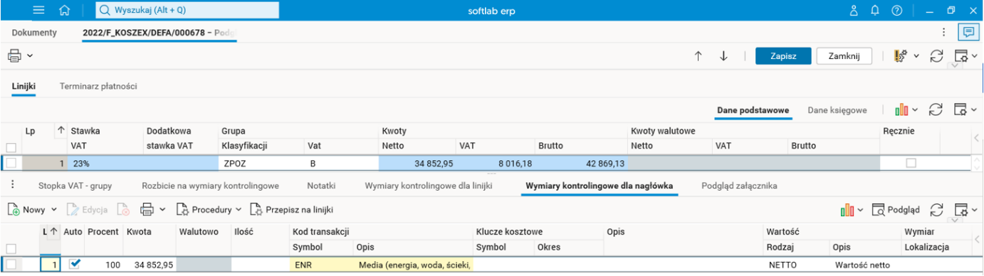 Rys. . Dowód – szczegół Wymiary kontrolingowe dla nagłówka, Kod transakcji