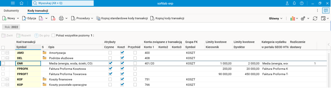 Rys. . Kody transakcji (Rodzaj kosztu)