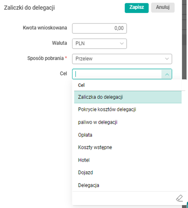Plany delegacji tworzone są za pomocą wniosków Plan delegacji krajowej oraz Plan delegacji zagranicznej, dostępnych na pulpicie Wnioski w kategorii Delegacje. W oknie edycji tych wniosków, w sekcji Zaliczki, po wybraniu przycisku Zarządzaj zaliczkami pojawia się możliwość dodania zaliczki. W oknie dodawania zaliczki do delegacji, w polu Cel wprowadzono rozwijaną listę. Po rozwinięciu listy można wybrać jedną z dostępnych na niej opcji. Dzięki temu nie trzeba za każdym razem samodzielnie formułować celu, co było to dotychczas konieczne.