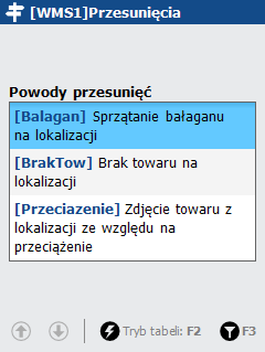 Po wyborze powodu przesunięcia dalsze etapy realizowane są w standardowy sposób, tj. odczytanie kodu lokalizacji lub nośnika, pobranie towaru, odłożenie towarów w lokalizacji docelowej.