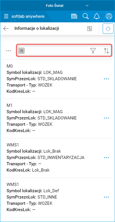 Rys. 1. Widok słownika Informacje o lokalizacji z widocznymi przyciskami do skanowania kodu, filtrowania i sortowania