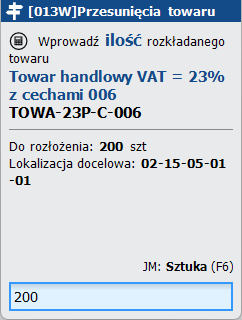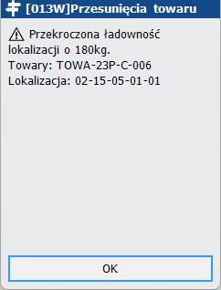 Gdy użytkownik w procesie przesunięcia towaru zamierza przenieść 200 sztuk towaru TOWA-23P-C-006 (ważącego łącznie 480kg) na pustą lokalizację 02-15-05-01-01, której maksymalna ładowność wynosi 300kg, system zablokuje operację, informując o przekroczeniu ładowności o 180 kg. W takim przypadku użytkownik musi przenieść całość na lokalizację o większej ładowności lub umieścić na tej lokalizacji tylko tyle towaru, aby łączna waga nie przekroczyła 300 kg. Pozostałą część towaru należy umieścić w innej lokalizacji.