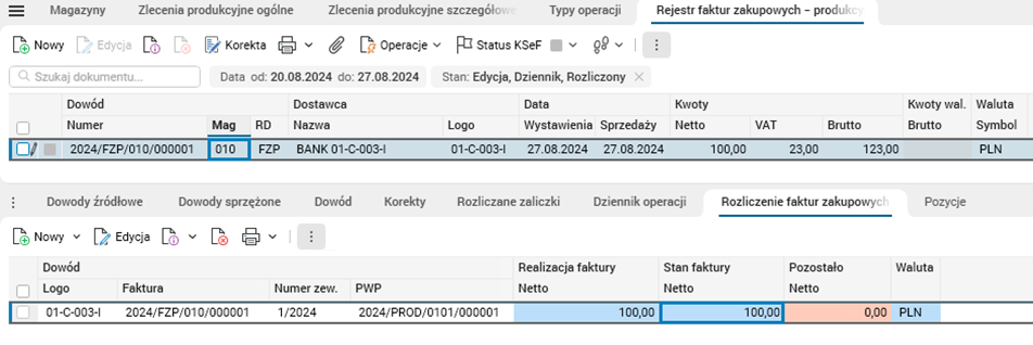 Rys. 1. Słownik Rejestr faktur zakupowych – produkcyjnych, szczegół Rozliczenie faktur zakupowych