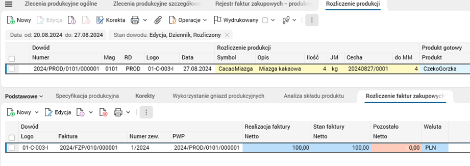 Rys. 2. Słownik Rozliczenie produkcji, szczegół Rozliczenie faktur zakupowych