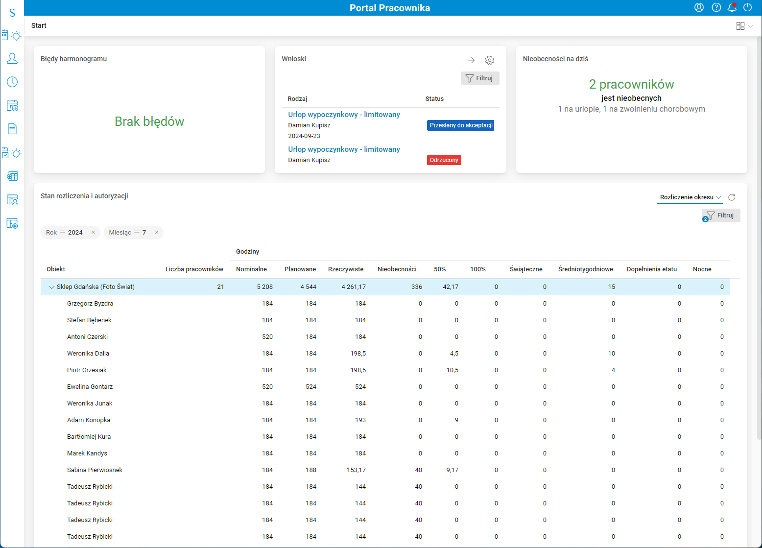 Dostęp do nowych widoków umożliwia kierownikowi podgląd oraz weryfikację planowanych i rzeczywistych godzin pracy pracowników wraz z nadgodzinami w podziale na obiekty, do których ma on nadane uprawnienia.
