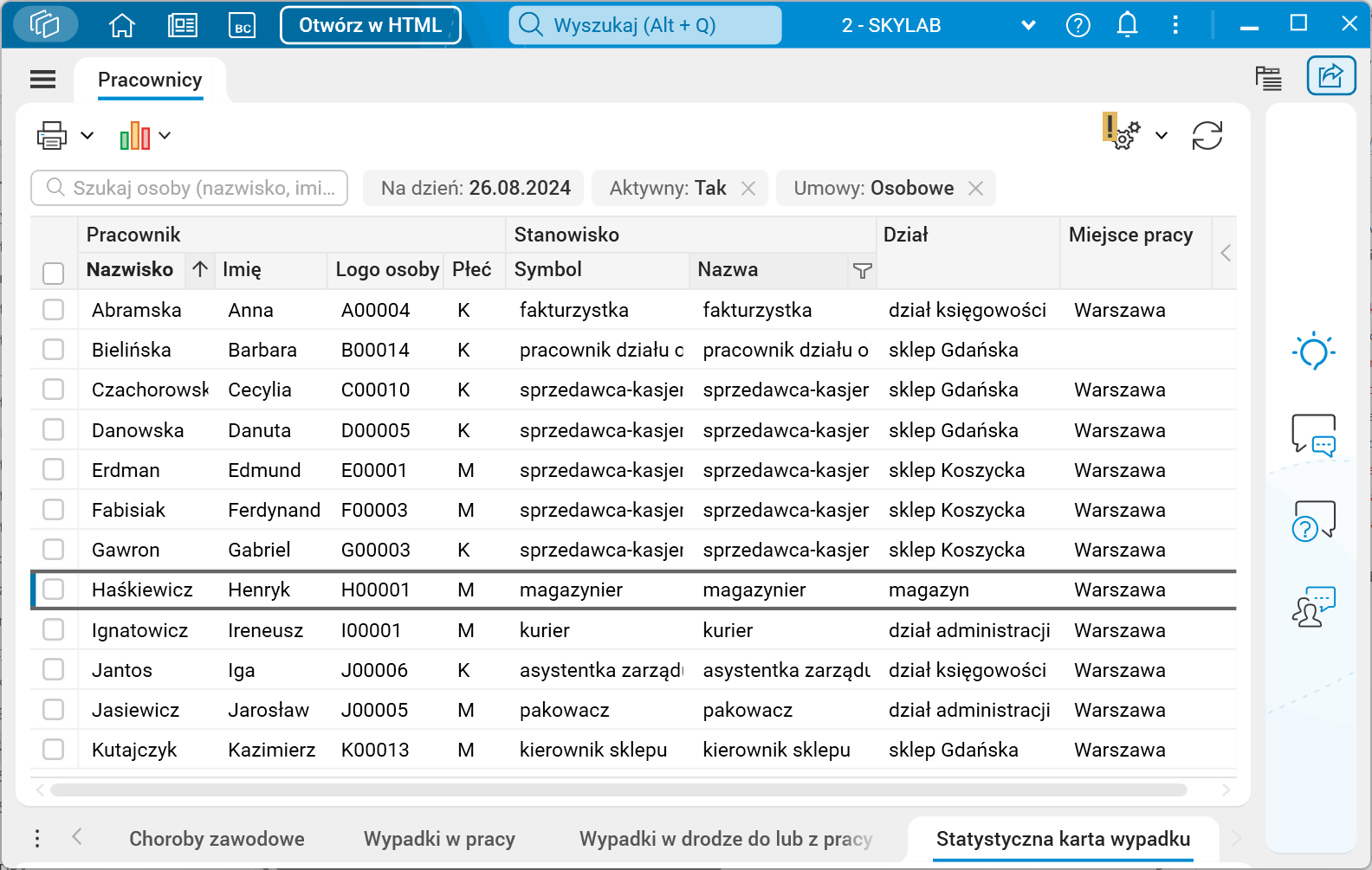 Słownik Pracownicy prezentuje dane wszystkich pracowników i osób współpracujących na podstawie umów cywilnoprawnych. Słownik ten działa w trybie tylko do odczytu. Oznacza to, że pracownik BHP ma uprawnienia jedynie do podglądu podstawowych danych pracowników, nie może ich modyfikować.