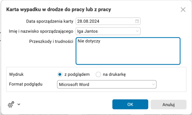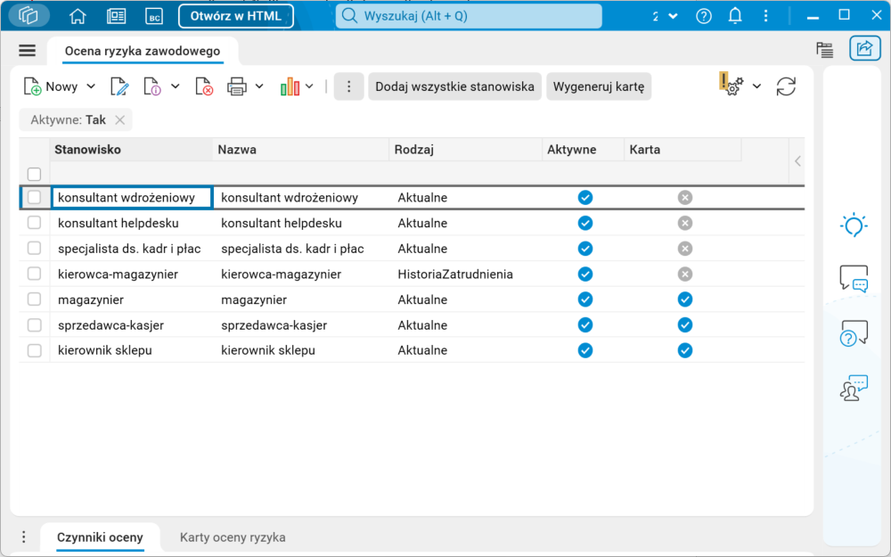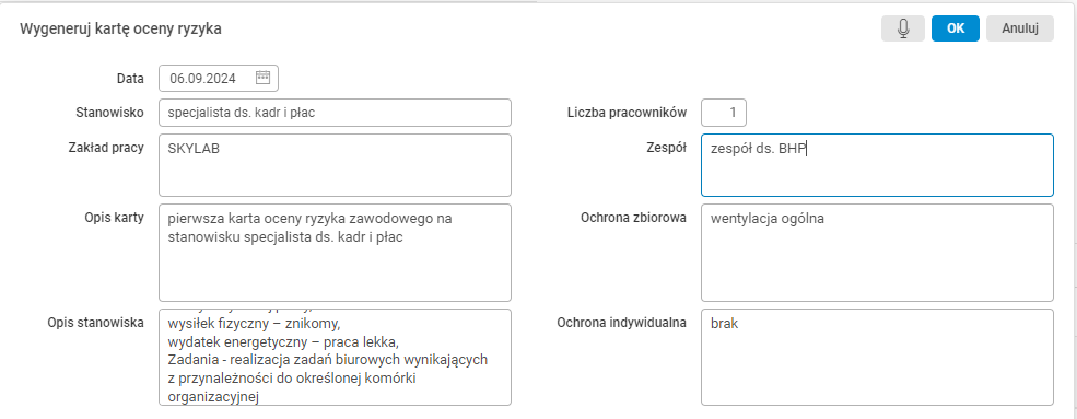 Słownik Ocena ryzyka zawodowego umożliwia wygenerowanie karty oceny ryzyka zawodowego.