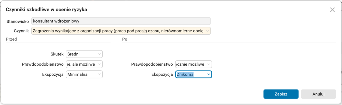 • Ekspozycja (Przed) – Czas ekspozycji (wystawienia) na czynnik niebezpieczny, oceniany przed zastosowaniem działań zapobiegawczych zmniejszających ryzyko.