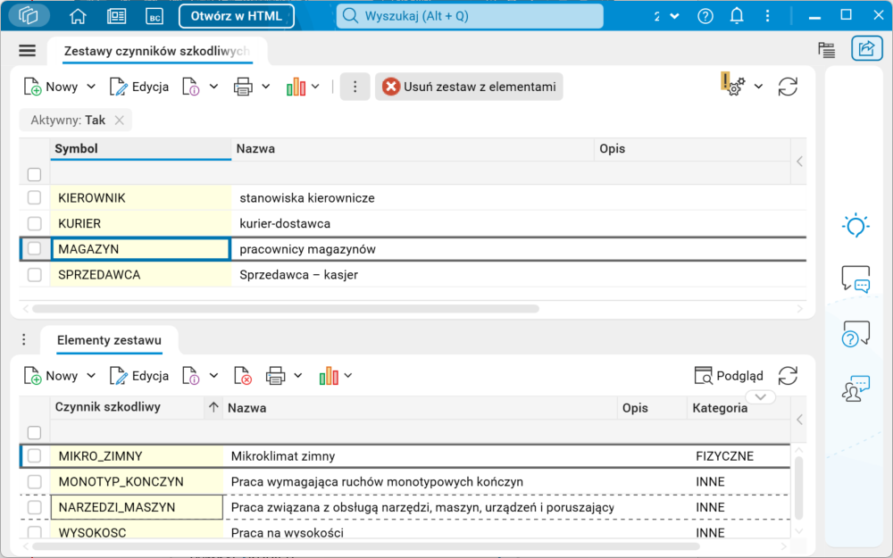 Istnieje możliwość zdefiniowania zestawu czynników szkodliwych. Do tego celu służy słownik Zestawy czynników szkodliwych. Utworzony w ten sposób zestaw można przypisać do dowolnego stanowiska lub grupy stanowisk.