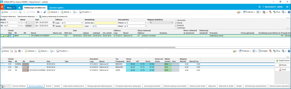 Do rozwiązania Asseco Softlab ERP została wprowadzona nowa funkcjonalność w obszarze reklamacji. Do aplikacji dodane zostały rejestry reklamacji: od odbiorców, wewnętrznych oraz do dostawców. Te ostatnie tworzone są na podstawie reklamacji otrzymanych zarówno od odbiorców, jak i reklamacji wewnętrznych.