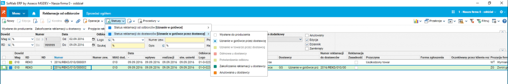 Obieg rozpatrywania reklamacji oraz sposób wystawiania dokumentów w procesie realizacji reklamacji jest oparty na statusach. Poprzez zmianę statusu wystawiane są dokumenty realizujące reklamację np. przesunięcie na magazyn serwisowy, zwrot towaru do dostawcy.