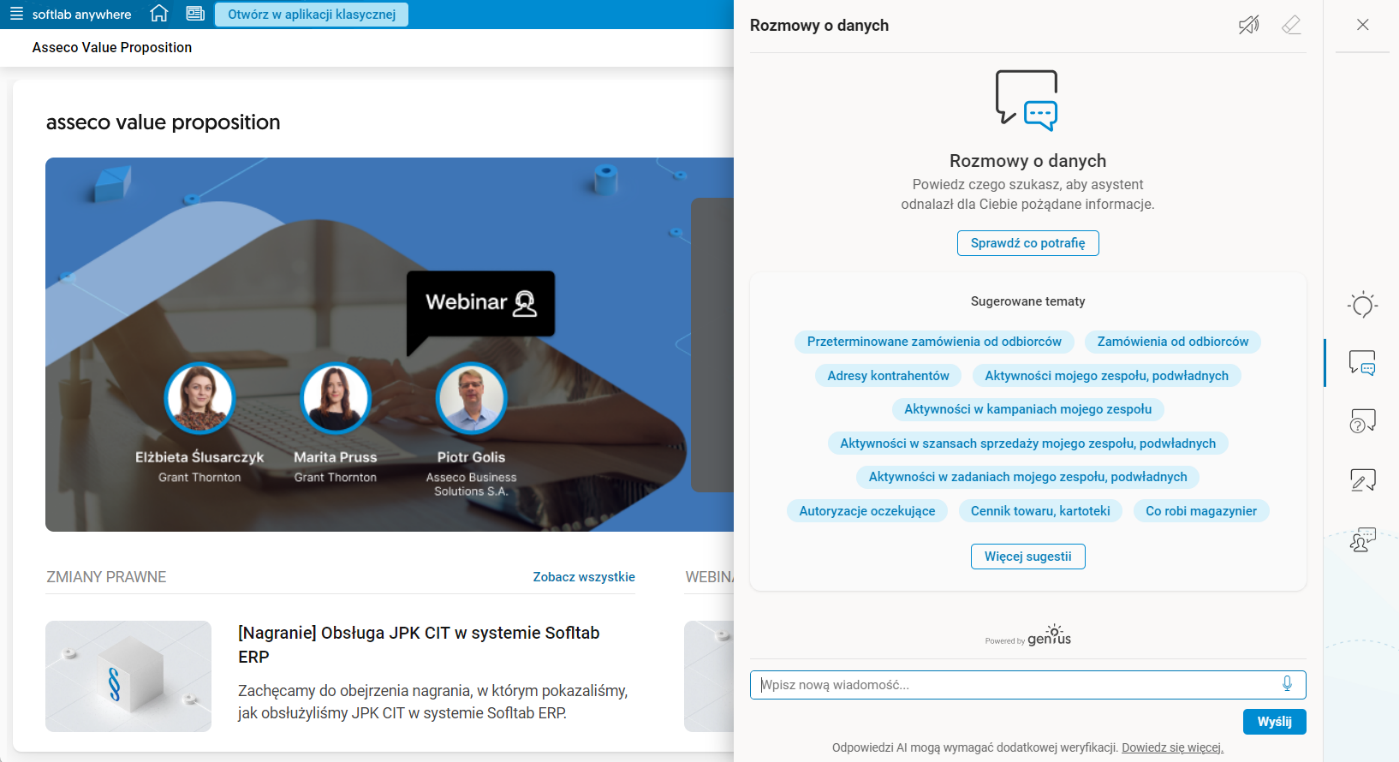 Jeśli mamy dostęp do panelu Inteligentny Asystent ERP (umieszczonego z prawej strony), możemy rozpocząć konwersację z Asystentem Danych, wybierając przycisk Rozmowy o danych. Po jego użyciu użytkownik zostanie przeniesiony do panelu rozmowy. Rozmawiać z Asystentem (AI) możemy na dwa sposoby: