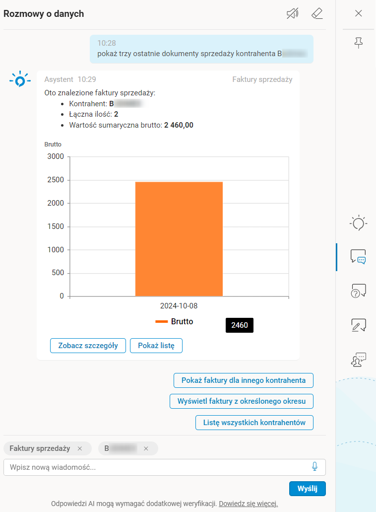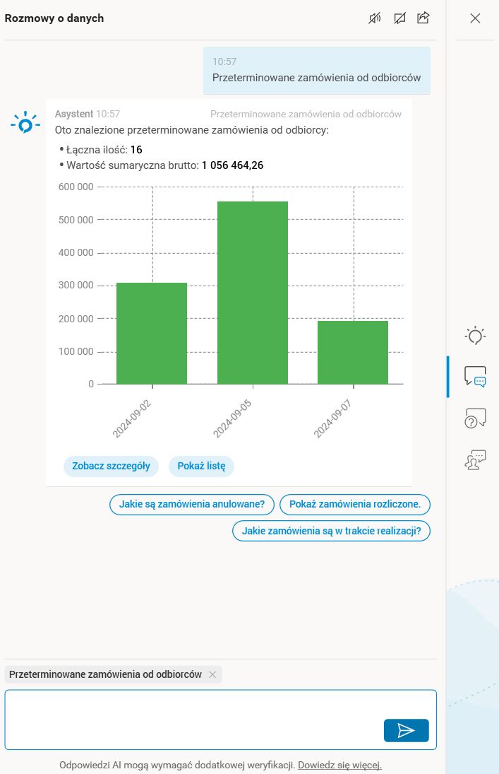 - Rozmowa głosowa: Użytkownik używając przycisku mikrofonu aktywuje tryb rozmowy głosowej, po czym używając mikrofonu może podyktować swoje pytanie. Na przykład: Pokaż trzy ostatnie zamówienia kontrahenta XYZ.