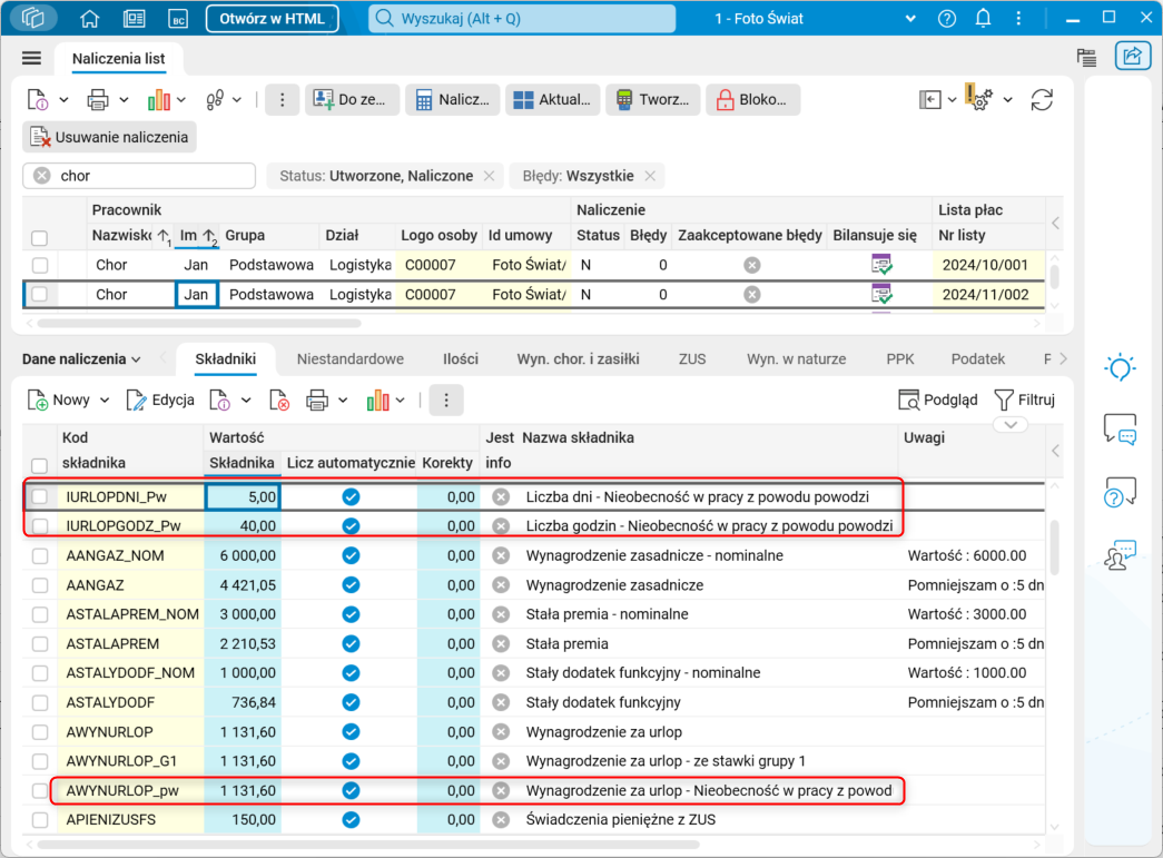 Z uwagi na wprowadzenie nowego rodzaju urlopu zostały dodane nowe składniki płacowe: