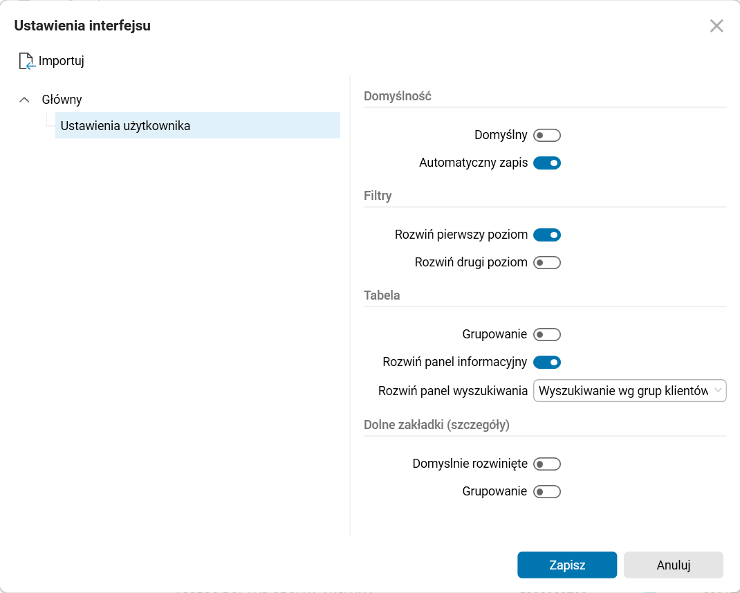 Okno Dodaj ustawienia działa identyczne jak okno widoczne po użyciu przycisku Dodaj, zaś okno Czy chcesz zaktualizować ustawienie? aktualizuje aktywne ustawienie bez wpływu na pozostałe. Jeśli użytkownik w danym ustawieniu chce włączyć automatyczny zapis lub oznaczyć je jako domyślne, może zrobić to w oknie Ustawienia interfejsu dostępnego po użyciu przycisku Zarządzaj.