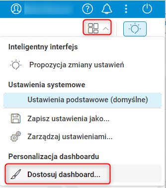 Aby uruchomić tryb personalizacji w słowniku, należy kliknąć przycisk Włącz tryb personalizacji. Jest on umieszczony w prawym górnym rogu aplikacji, na belce z nazwą słownika i wizualizowany jest ikoną czterech prostokątów. Następnie z rozwiniętego menu wybieramy opcję Dostosuj dashboard….