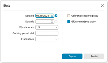 Kontrola odbywa się podczas edycji danych w szczególe Etaty w słowniku Pracownicy. Podczas dodawania lub zmiany wartości w polach Wymiar etatu lub Etat zasiłek sprawdzane jest, czy suma wartości w tych dwóch polach nie przekracza pełnego etatu.