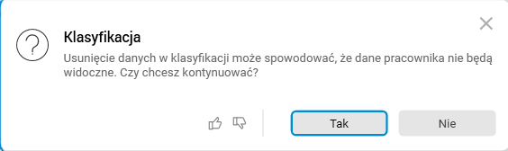 - Ostrzeżenie podczas usuwania danych dotyczących klasyfikacji pracownika,