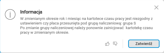 Przy zmianach grupy naliczeniowej w szczególe Klasyfikacja słownika Pracownicy lub poprzez aneksowanie umowy o pracę (za pomocą procedury Zmiana warunków pracy) odbywa się sprawdzenie, czy zmiana grupy nie spowoduje zmiany terminu wypłaty wynagrodzenia określonego w polu Płaca przesunięta dla grupy naliczeniowej pracownika, zdefiniowanej w słowniku Grupy naliczeniowe. Jeżeli to nastąpi, sprawdzona zostanie zgodność roku i miesiąca, zapisanych w polach Wypłata;Rok i Wypłata;Miesiąc w szczególe Kartoteka czasu pracy w słowniku Pracownicy z ustawieniem pola Płaca przesunięta dla grupy naliczeniowej pracownika.