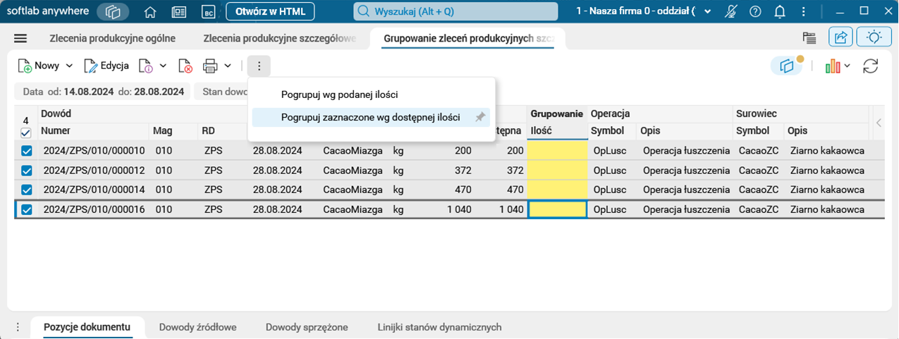 - Za pomocą procedury Pogrupuj wg dostępnej ilości. W tym przypadku do grupowania będą brane zlecenia zaznaczone w trybie pracy grupowej.