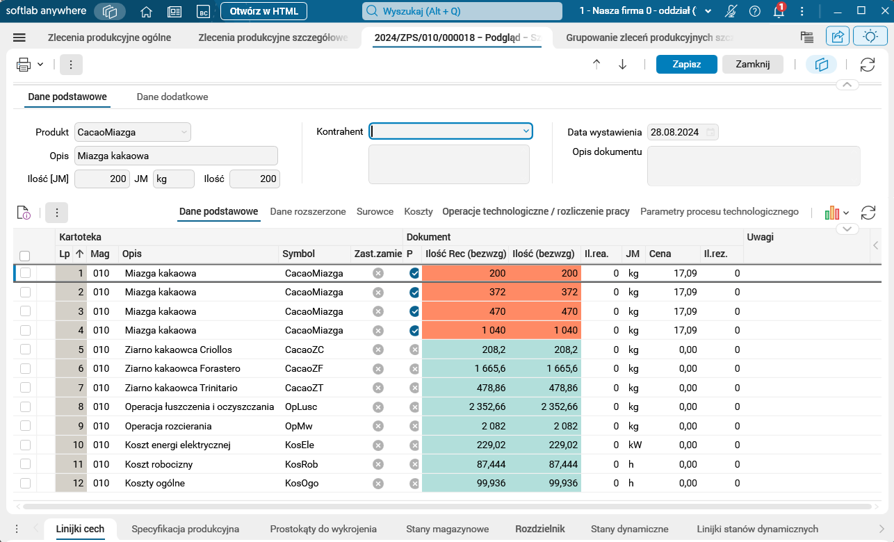 Wprowadzono zmianę w funkcjonalności grupowania zleceń produkcyjnych szczegółowych w ramach jednego zlecenia, umożliwiającą łączenie surowców i półproduktów z różnych zleceń produkcyjnych realizowanych w jednym procesie technologicznym.