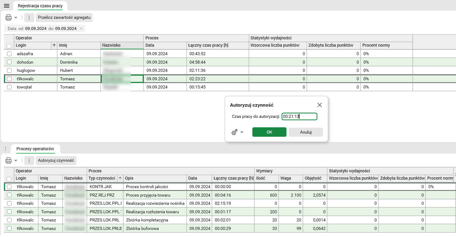 Dotychczas statystyki czasu pracy operatorów były liczone wyłącznie do głównej czynności, np. kompletacja, przyjęcie dostawy itp. W związku z tym brakowało możliwości określenia bardziej szczegółowych informacji o charakterze pracy wykonywanej przez operatora, np. o rodzaju wykonywanej zbiórki lub trybie przyjęcia dostawy. Celem tej zmiany jest umożliwienie dokładniejszej analizy statystyk pracy operatorów dla czynności, dla których wcześniej nie było to możliwe. Ponadto, aby skutecznie kontrolować czas pracy dla czynności dodatkowych, dodano funkcjonalność autoryzacji czasu pracy.