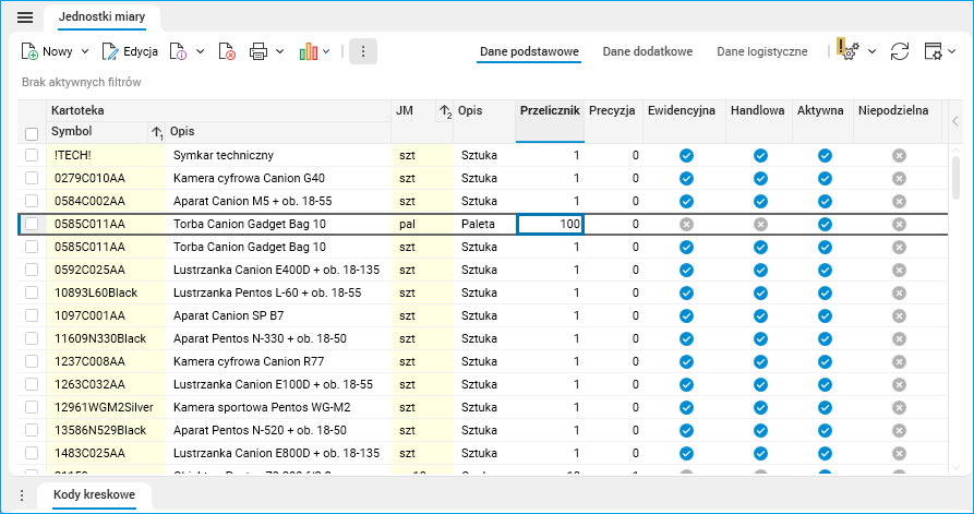 Rys. 1. Słownik Jednostki miary z przedstawionym przelicznikiem dla jednostki miary „paleta”