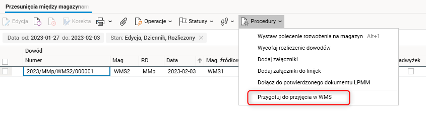 Procedura Przygotuj do przyjęcia w WMS służy do wystawienia dokumentu LPMM, który odpowiada za awizację dostaw w obiegu przesunięcia między magazynami.