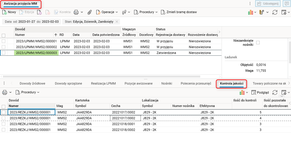 W systemie wystawiono awizo przyjęcia LPMM, a następnie przy użyciu terminala radiowego przyjęto towar i rozwieziono go. Do dowodu LPMM system automatycznie wystawił kontrolę jakości. Podczas przyjęcia dostawy z innego magazynu, zgodnie z dodatkową konfiguracją, system wystawił automatyczną rezerwację towaru na potrzeby wykonania kontroli jakości. Dla opisanego przypadku, w procesie konfiguracji przyjęcia towaru ustalono, że dla każdego towaru będzie prowadzona kontrola jakości. W zależności od potrzeb, na wdrożeniu można ustalić inny algorytm wyznaczający potrzebę przeprowadzenia kontroli jakości, np. przynależność do danej grupy towarowej, minimalną wartość towaru itp. (niektóre algorytmy nie są dostępne w standardowej wersji systemu, takie jak wcześniej wspomniana minimalna wartość towaru i wymagają one dodatkowych konfiguracji wdrożeniowych).