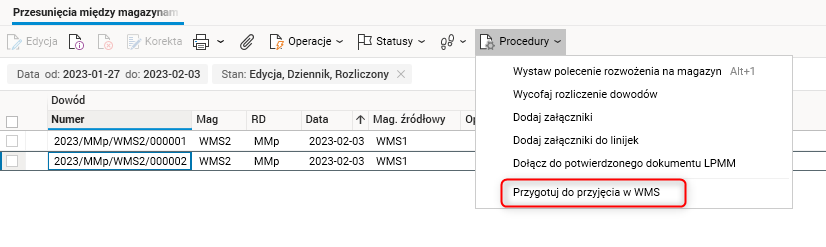 - Wystawić dokument LPMM do dowodu MMp. W tym celu należy zaznaczyć dwa dowody MMp, na podstawie których ma być realizowana jedna dostawa, a następnie otworzyć słownik Przesunięcia między magazynami – przyjęcia i uruchomić procedurę Przygotuj do przyjęcia w WMS.