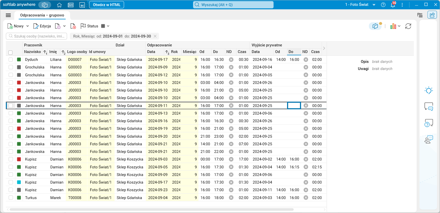 - pulpit Odpracowania – grupowo dla użytkowników z uprawnieniami menadżera.