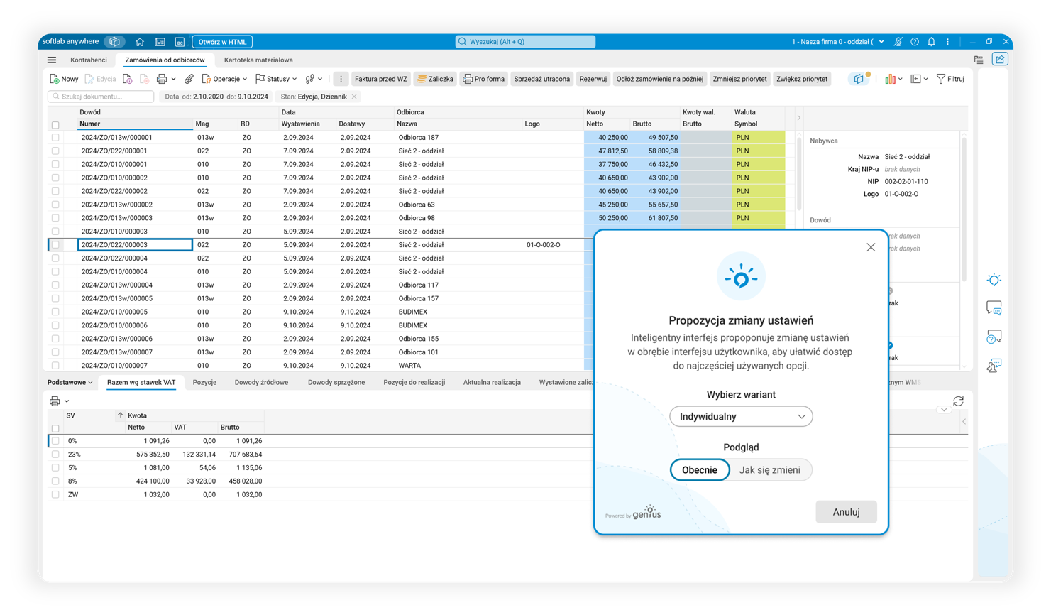 - Propozycja zmiany ustawień: System wyświetla propozycje modyfikacji interfejsu, np. zmiany układu zakładek czy kolumn, dostosowane do stylu pracy konkretnego użytkownika.