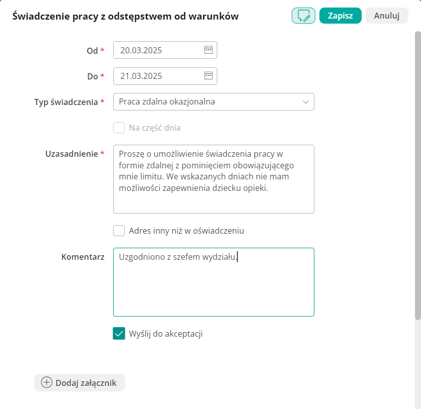 W zależności od konfiguracji typu wybranego świadczenia, w formularzu mogą być widoczne również inne pola do uzupełnienia, np. adres, pod którym chcemy świadczyć pracę zdalną, lub oświadczenie o posiadaniu odpowiednich warunków do świadczenia pracy w tej formie.
