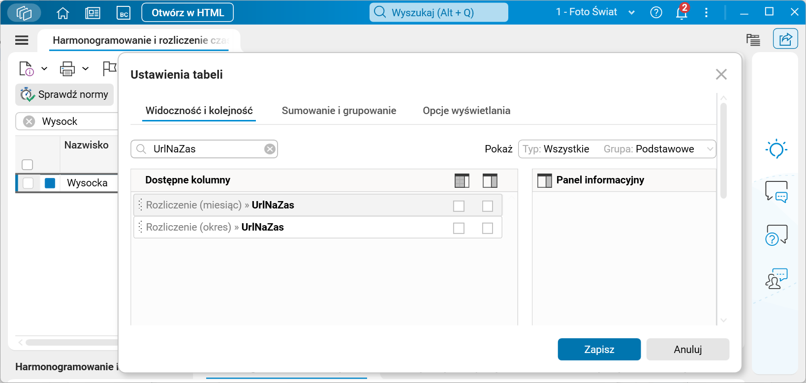 Rys. Nowe kolumny w oknie Ustawienia tabeli w słowniku Harmonogramowanie i rozliczenie czasu pracy