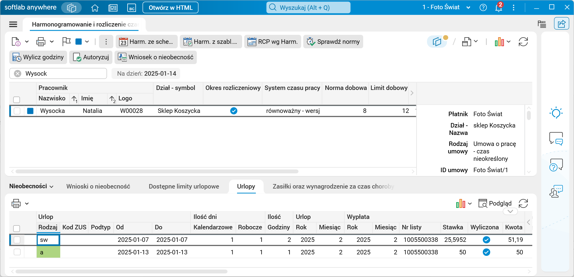Rys. Zarejestrowane urlopy na część dnia w danym miesiącu widoczne w szczególe Urlopy słownika Harmonogramowanie i rozliczenie czasu pracy