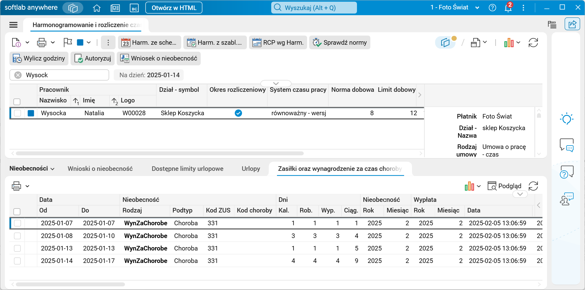 W ramach tej zmiany, w celu ułatwienia analizowania danych, w nowych kolumnach słownika Harmonogramowanie i rozliczenie czasu pracy udostępnione zostało podsumowanie liczby godzin urlopu łączonego z absencją chorobową w miesiącu oraz w okresie rozliczeniowym. Jeśli uruchomione zostanie pomniejszanie sumy nadgodzin średniotygodniowych o godziny urlopu podczas zwolnienia lekarskiego, kolumny te będą prezentować sumy godzin takich urlopów.