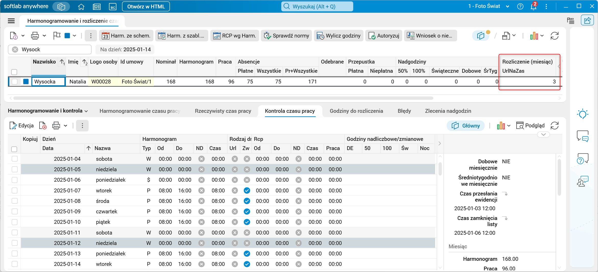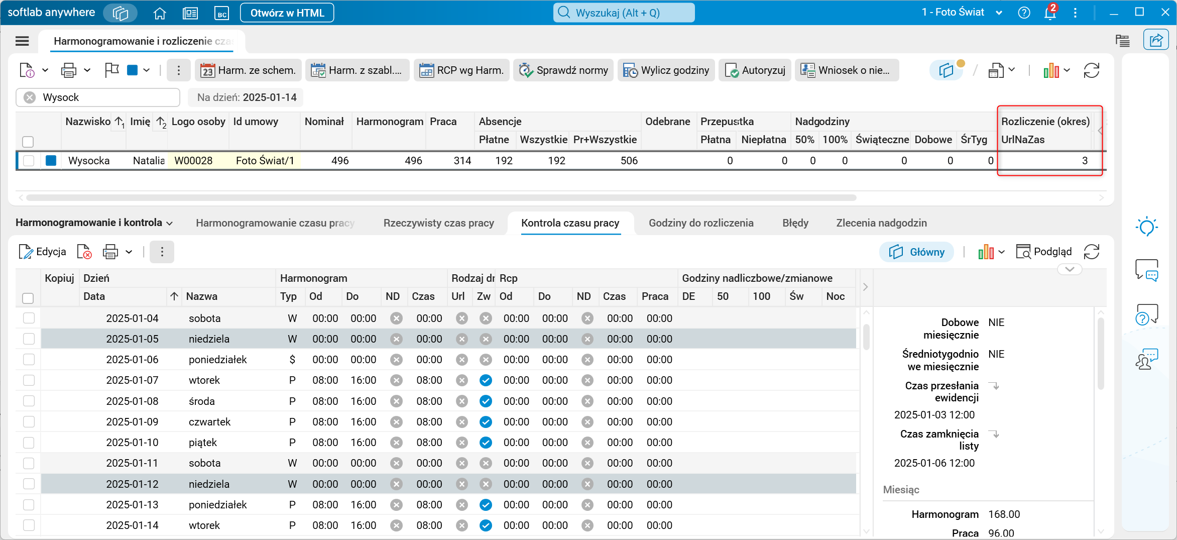 Rys. Pomniejszone nadgodziny średniotygodniowe oraz suma liczby godzin urlopów łączonych z absencją chorobową w nowej kolumnie UrlNaZas w zakładce Rozliczenie (okres) słownika Harmonogramowanie i rozliczenie czasu pracy (uruchomiona funkcjonalność)
