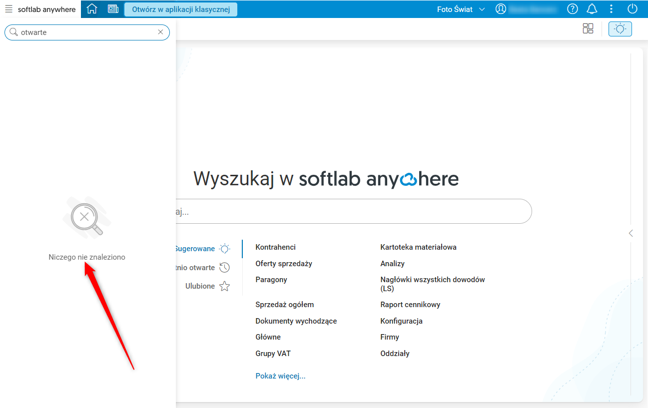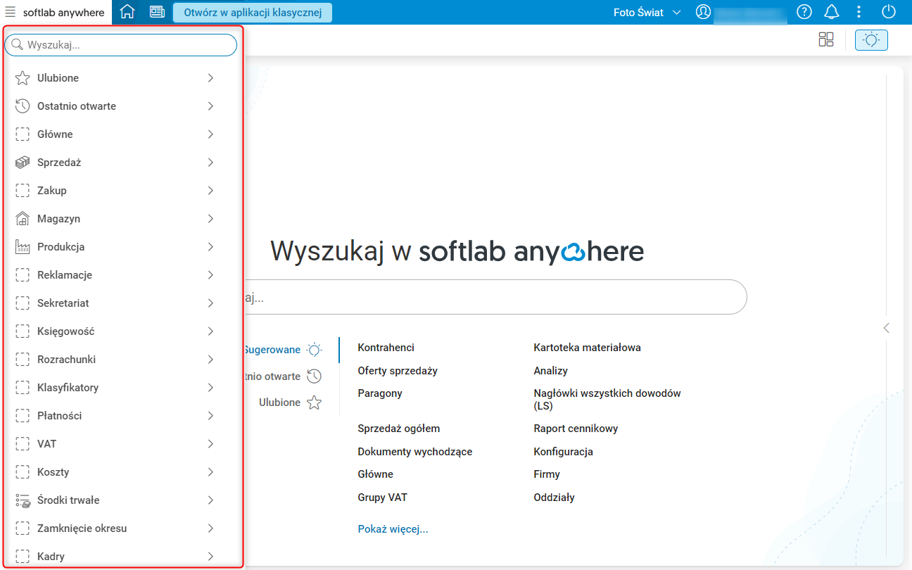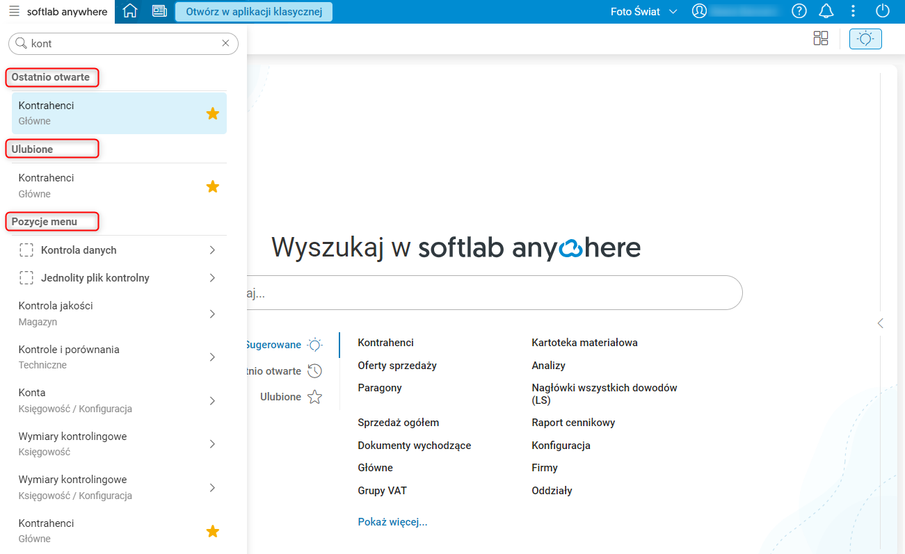 Pole Wyszukaj… umożliwia wyszukiwanie pożądanej pozycji w menu, a wyniki są prezentowane w sposób zorganizowany, zgodnie z układem całego menu, podzielone na sekcje: Ostatnio otwarte, Ulubione i Pozycje menu.