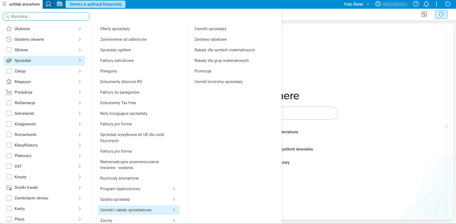 - Pozycje menu – menu systemu Softlab z funkcjonalnościami dostępnymi dla użytkownika.