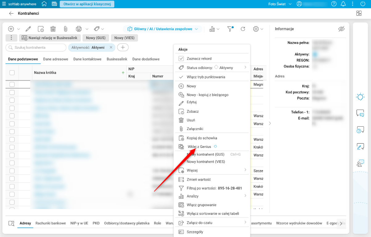 Akcja Wklej z Genius jest dostępna w menu kontekstowym, rozwijanym przy użyciu prawego przycisku myszy (PPM) na rekordzie oraz w oknie dialogowym na maskach. Natomiast na formularzach edycyjnych i w procedurach, akcja dostępna jest za pomocą skrótu klawiszowego <Ctrl+Alt+V> po umieszczeniu kursora na dowolnym polu.