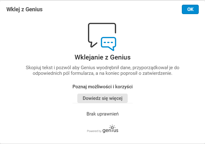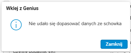 Jeżeli użytkownik nie posiada dostępu do funkcjonalności Wklej z Genius, po użyciu akcji pojawi się komunikat informujący o braku uprawnień.