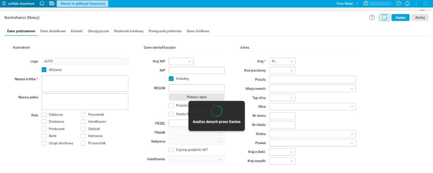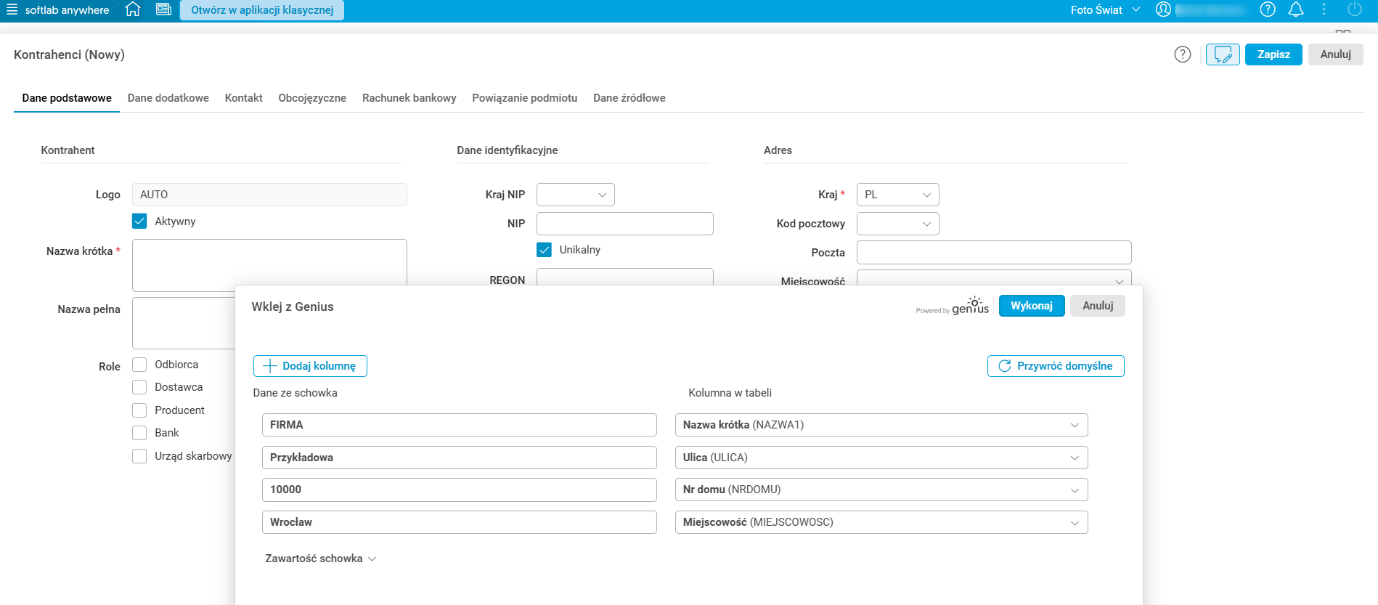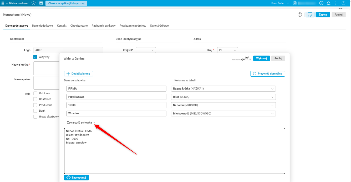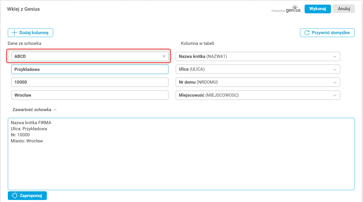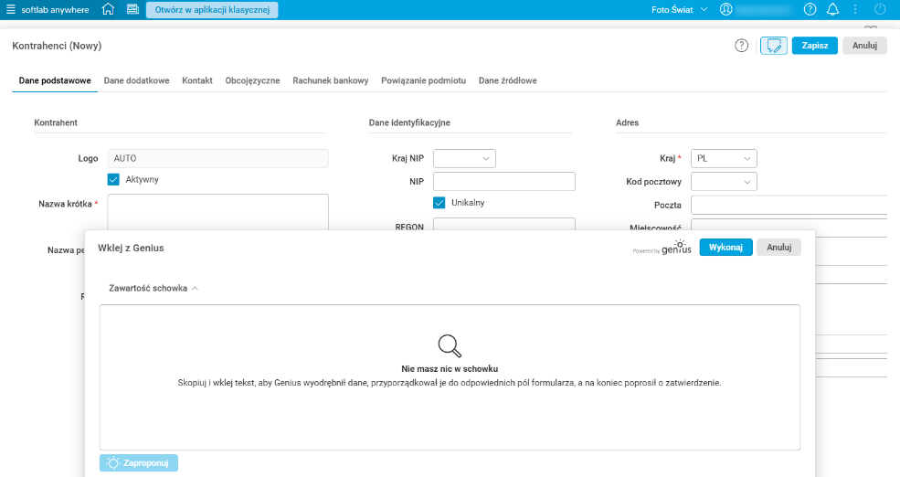 Jeśli w schowku nie znajdują się żadne dane, wówczas po użyciu akcji Wklej z Genius w oknie Wklej z Genius zostanie rozwinięta sekcja Zawartość schowka z informacją, że w schowku nie ma żadnych danych. Wówczas użytkownik może w sekcji Zawartość schowka wkleić potrzebne dane lub wpisać je ręcznie. Następnie, po użyciu przycisku Zaproponuj, dane zostaną poddane analizom przez AI, a ta zaproponuje przypisanie ich do odpowiednich pól.